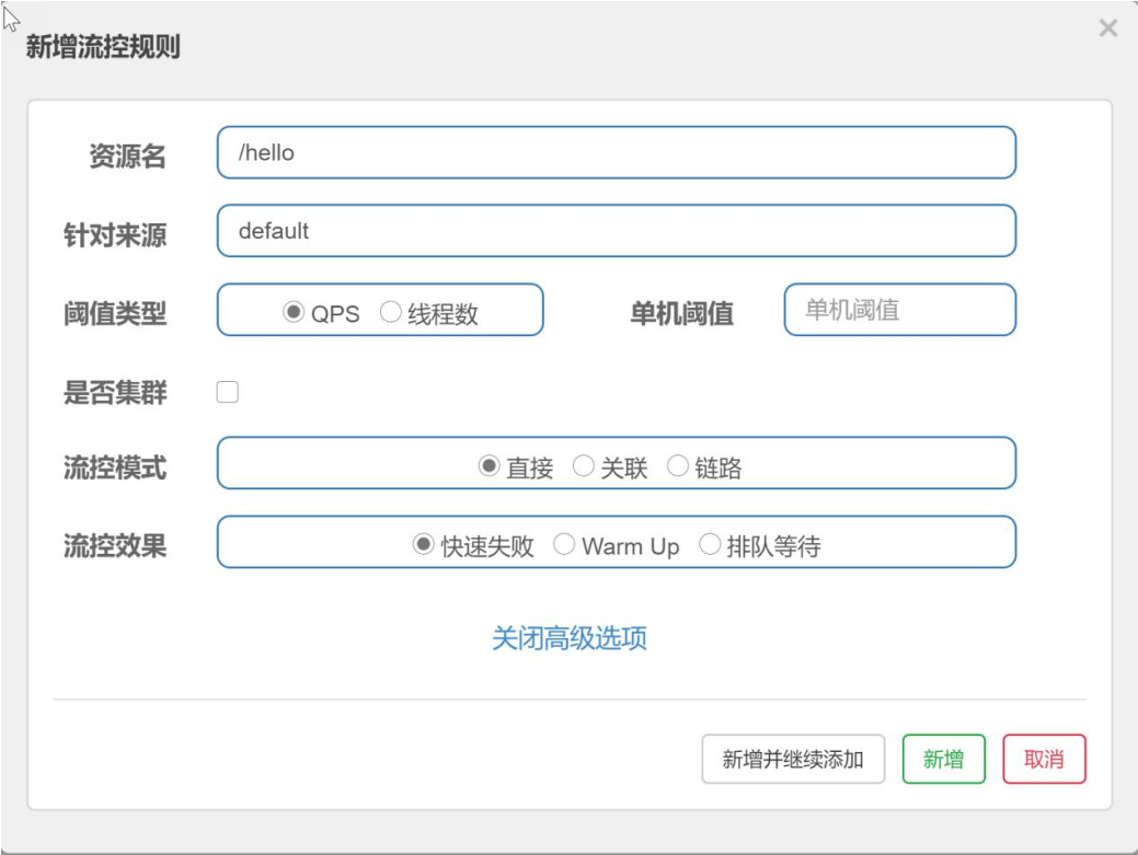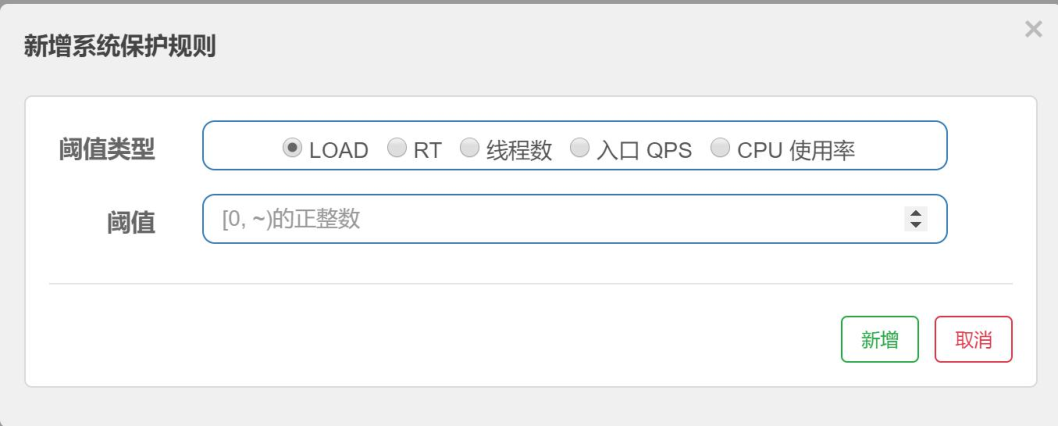 系统规则则是针对整个系统设置限流规则,并不针对某个资源,设置页面如下: