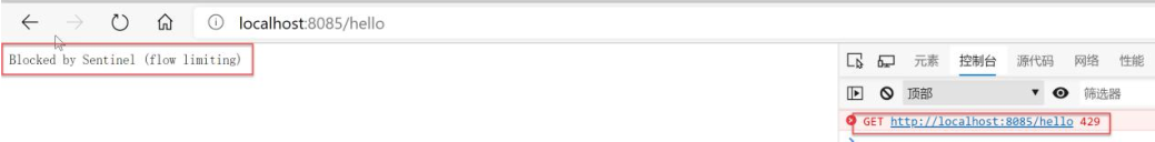 最快的手速点刷新,一开始会常看到 Blocked by Sentinel (flow limiting)的提示,10 秒后几乎不再出现(因为你的手速很难达到 1秒 10 下)。