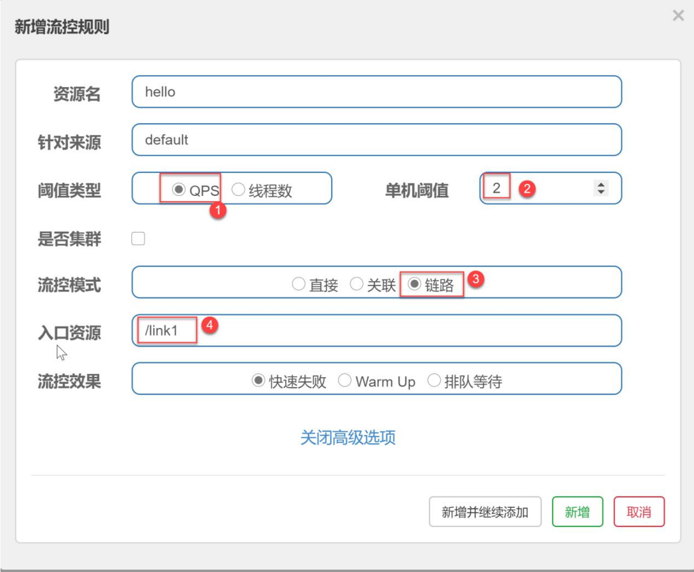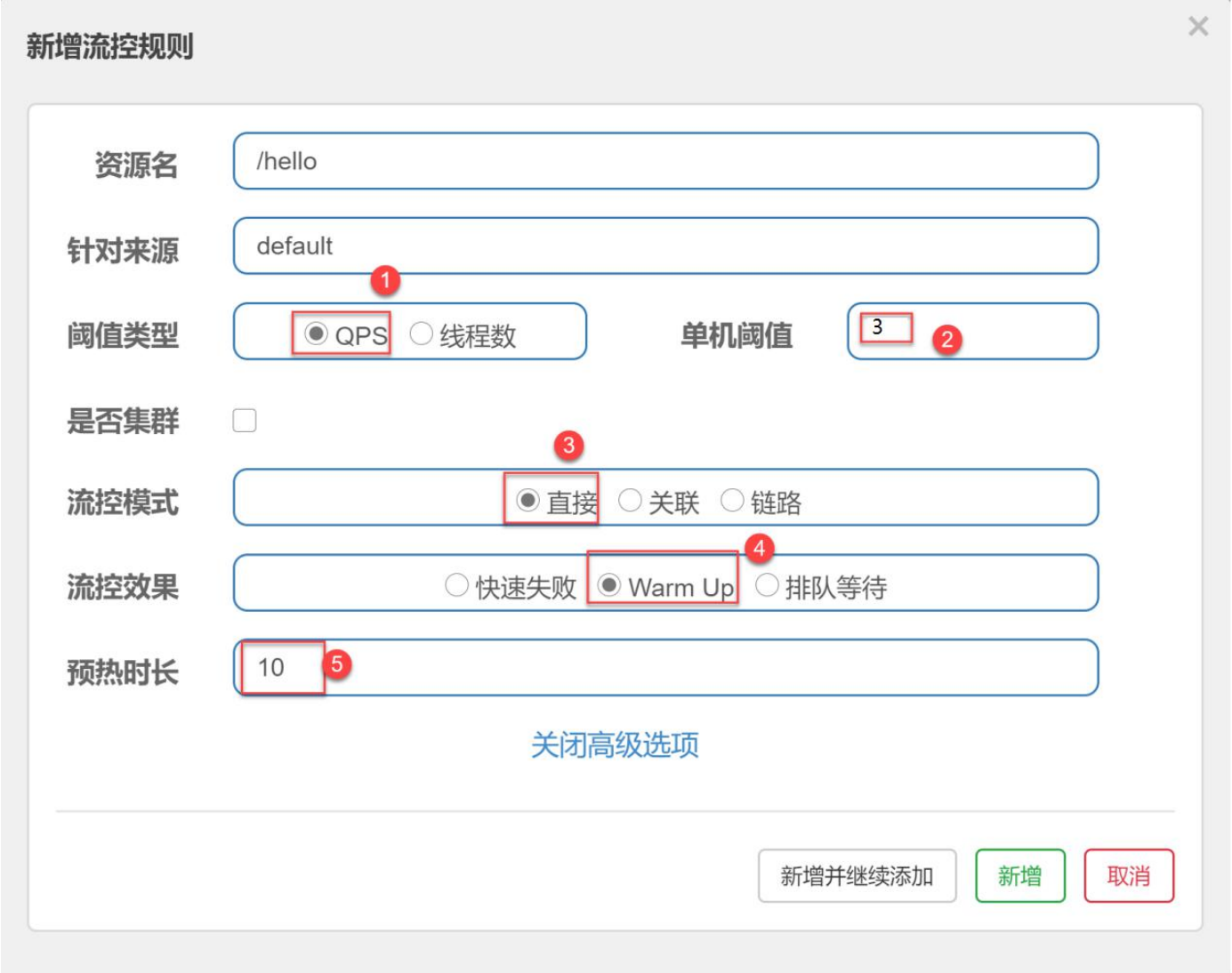 上面的配置意思是:对于/hello 资源,一开始的 QPS 阈值为 3,经过 10 秒后,QPS 阈值达到 10。