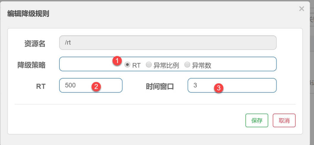 - RT,平均响应时间 (DEGRADE_GRADE_RT):当 1s 内持续进入 5 个请求,对应时刻的平均响应时间(秒级)均超过阈值(count,以 ms 为单位),那么在接下的时间窗口(DegradeRule 中的 timeWindow,以 s 为单位)之内,对这个方法的调用都会自动地熔断(抛出 DegradeException)。注意 Sentinel 默认统计的 RT 上限是 4900 ms,超出 此 阈 值 的 都 会 算 作 4900 ms , 若 需 要 变 更 此 上 限 可 以 通 过 启 动 配 置 项-Dcsp.sentinel.statistic.max.rt=xxx 来配置。