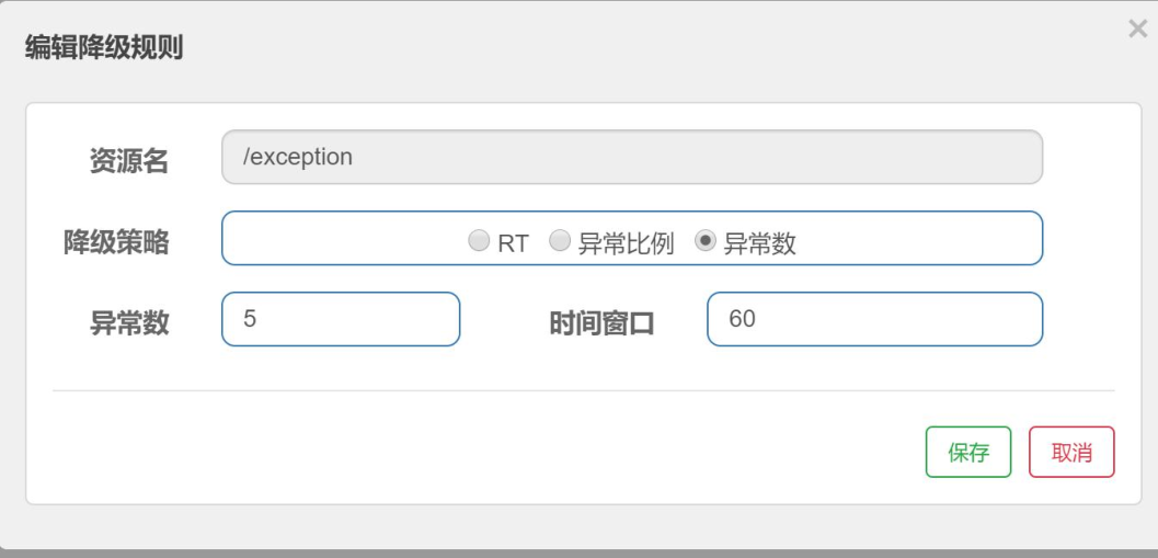 上面的规则表示:在 60 秒内,访问/exception 请求异常的次数大于等于 5,则触发降级。