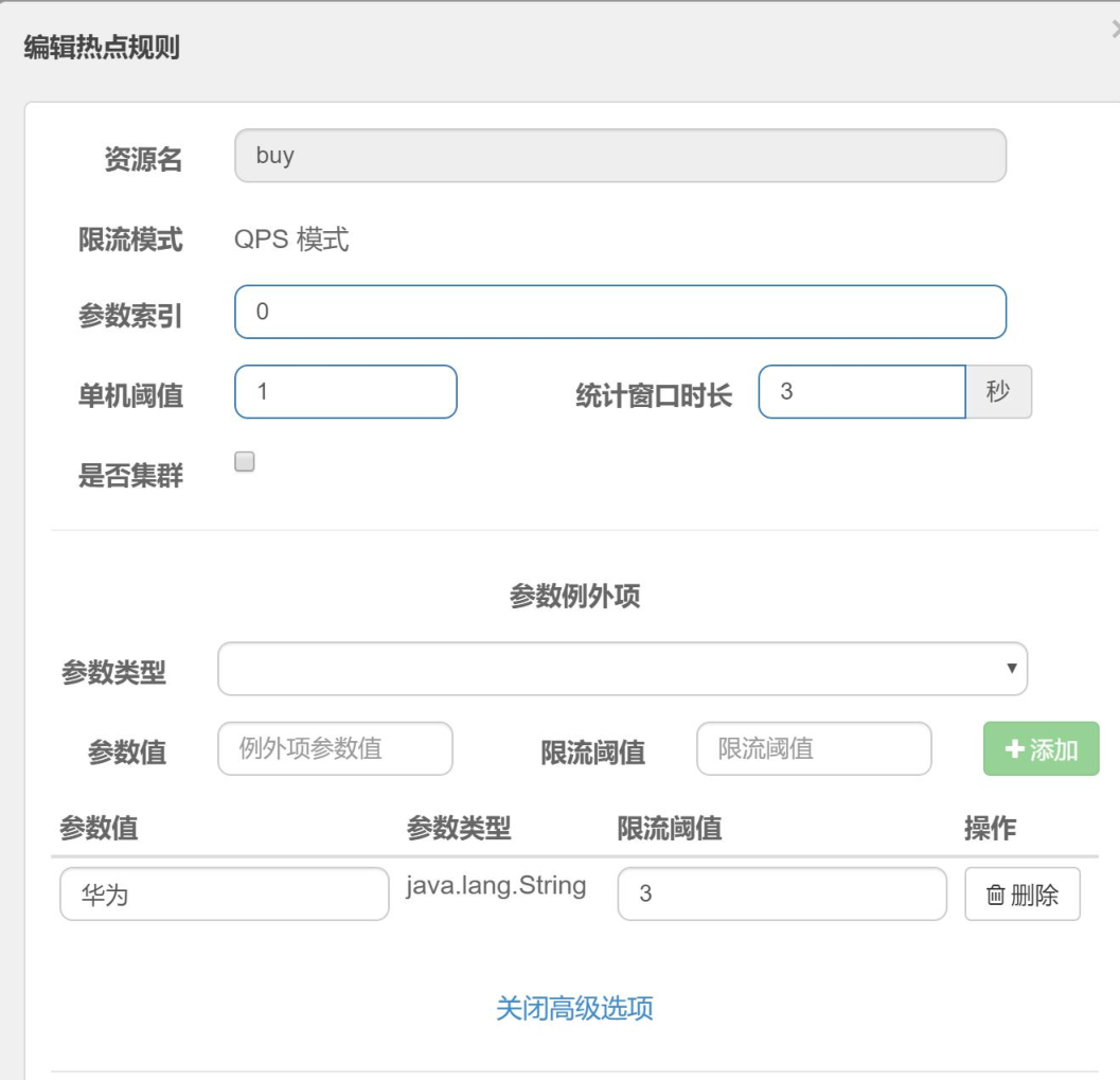 上面的配置含义是:对 buy 资源添加热点规则,当第 0 个参数的值为华为的时候 QPS阈值为 3,否则为1。此外,如果第 0 个参数不传,那么这笔请求不受该热点规则限制。