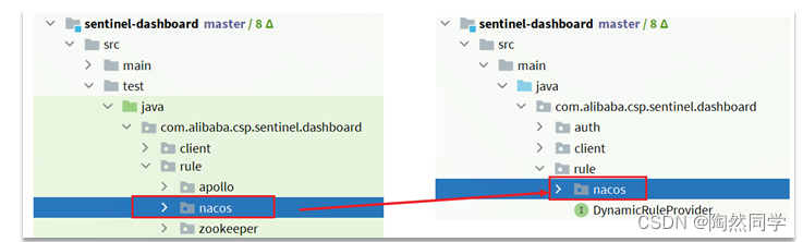 在sentinel-dashboard的test包下,已经编写了对nacos的支持,我们需要将其拷贝到main下。