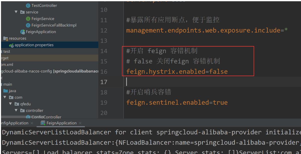 2.在配置文件开启哨兵容错(前提是先关闭feign的容错,因为这里要测试Sentinel的容错机制,又因为Feign的容错机制的优先级高于Sentinel的容错的优先级,所以要关闭Feign的容错,我先不关闭Feign的容错进行测试)