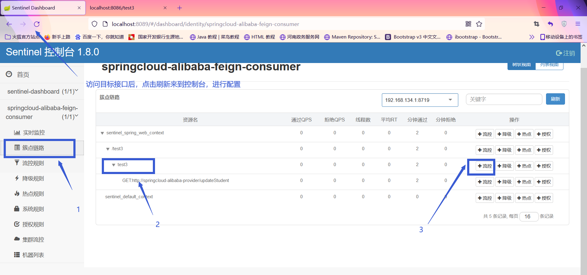 1.配置熔断降级规则 ,在FeignTestController中进行配置,然后重启应用,然后访问:http://localhost:8086/test3 (由于我配置了nacos,所以在每次启动应用以前,我的nacos都是开启的状态,就没关闭过,方便测试)