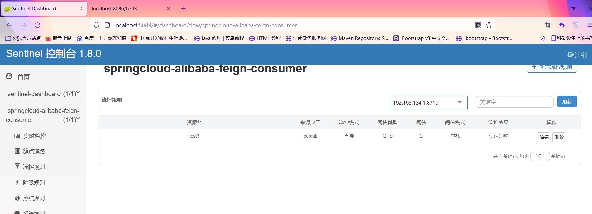 2.在控制台增加流控规则 (一定要注意,应用重启,流控规则失效)