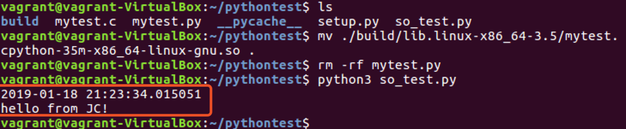 切换至pythontest文件夹,先运行so_test.py脚本(为了显示时间,便于跟后面的程序区分),再运行setup.py对mytest.py程序加密,命令如下: