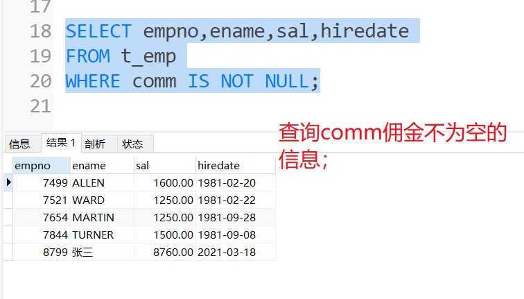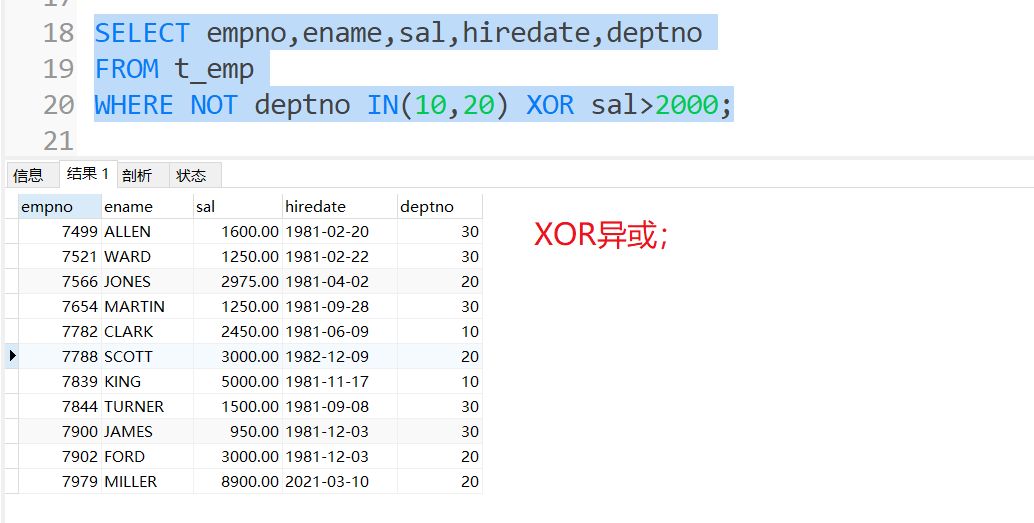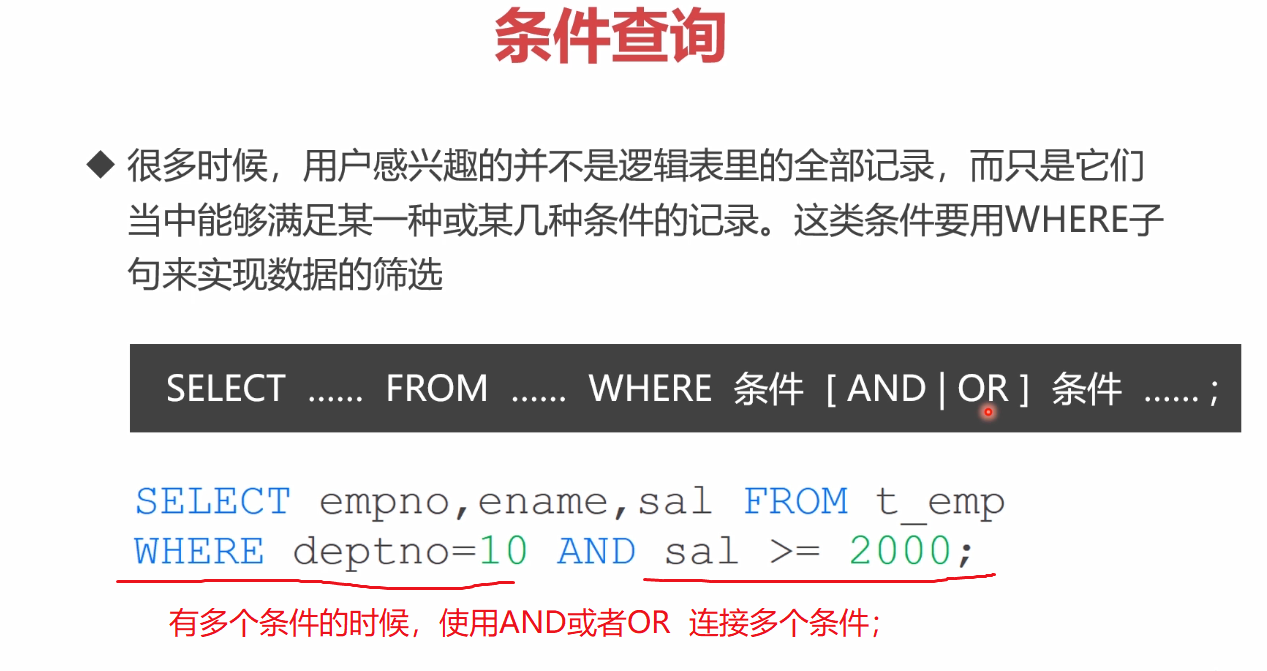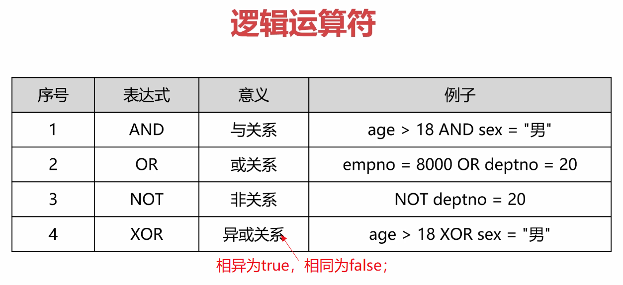 条件查询的核心是WHERE子句中使用的运算符!!!