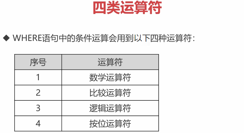 ● 在WHERE子句中,为了满足具体的需求,需要各种运算符的配合;