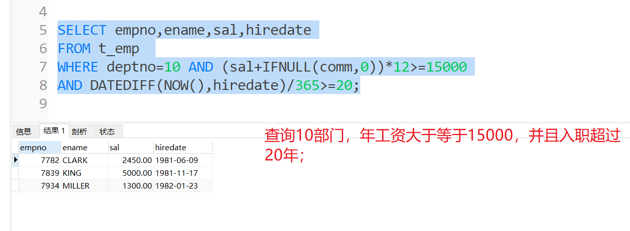 案例: 查询部门是10的,年工资大于15000,并且入职超过20年的员工信息: