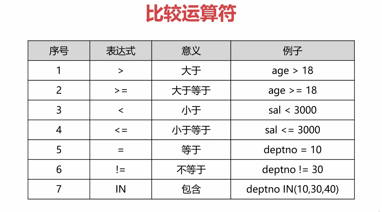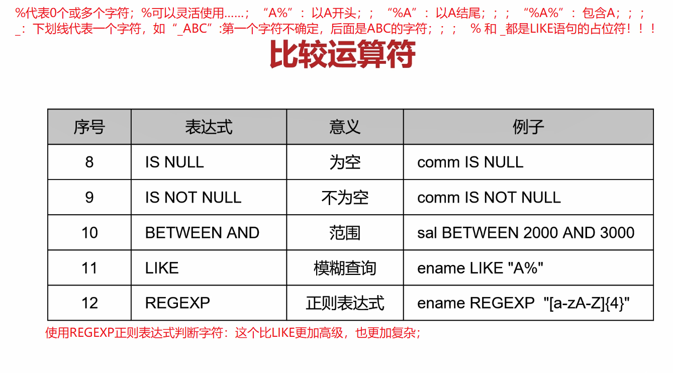 比较运算符:>,>=,<,<=,=,!=,IN,IS NULL,IS NOT NULL,BETWEEN AND,LIKE,REGEXP;
