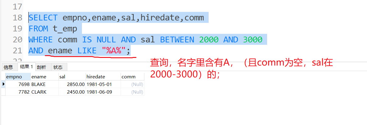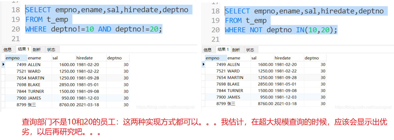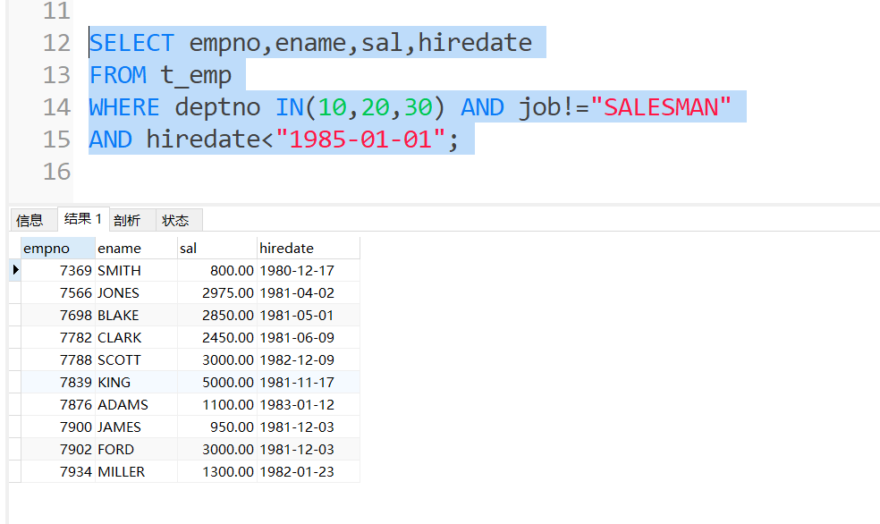 案例:查询10,20,30部门里,在1985年以前入职的员工,而且职位不能是“SALESMAN”的员工信息,而且是1985年以前入职的员工信息: