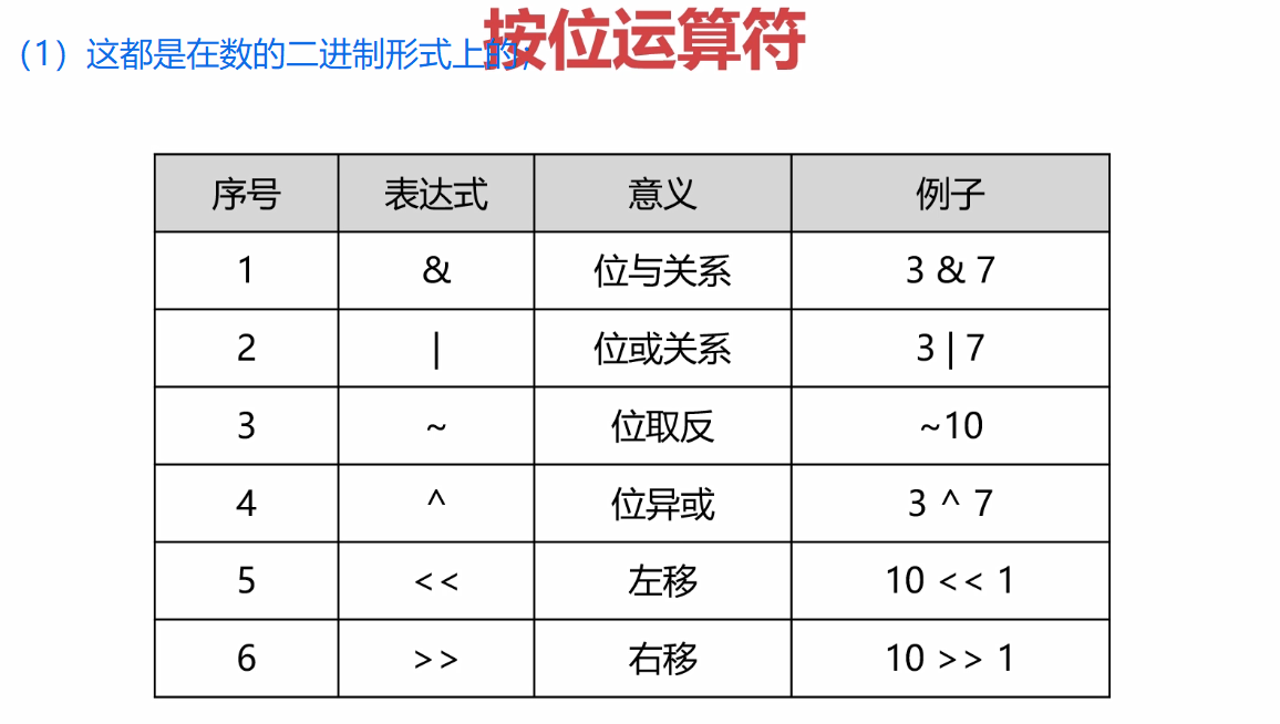 按位运算符:&,|,~,^,<<,>>;位运算符很少使用;