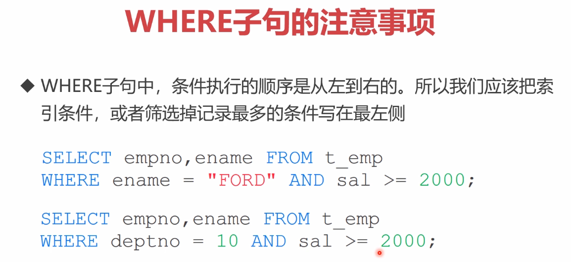 (1)应该把索引条件写在最左侧:利用索引可以快速缩小查询数据的范围,可以提升查询速度;比如上图的第一个例子,比如t_emp表的ename字段设置了索引,那么查询的时候,WHERE子句中,ename应该写在最左侧;