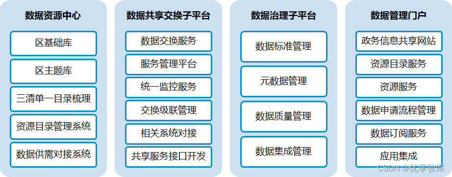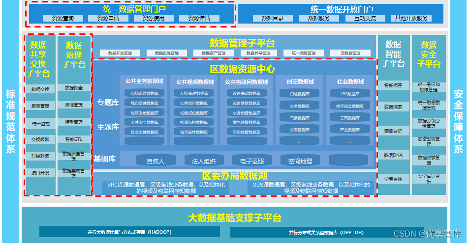 区大数据资源平台一期的建设内容主要包含:大数据基础支撑子平台、区级数据资源中心、数据共享交换子平台、数据治理子平台、数据管理子平台、数据安全子平台和统一数据管理门户