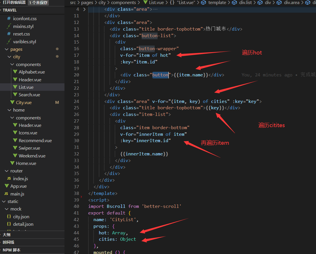 <div class="area" v-for="(item, key) of cities" :key="key">
