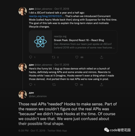 然而,一年后,dan 继续表示:React 缺少了一些让调度工作更简单的东西,这就是 Hooks。
