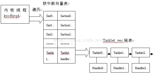 上图可以看出, ksoftirqd 是一个后台运行的内核线程,它会周期的遍历软中断的向量列表,如果发现哪个软中断向量被挂起了( pend ),就执行对应的处理函数,对于 tasklet 来说,此处理函数就是 tasklet_action ,这个处理函数在系统启动时初始化软中断的就挂接了。Tasklet_action 函数,遍历一个全局的 tasklet_vec 链表(此链表对于 SMP 系统是每个 CPU 都有一个),此链表中的元素为 tasklet_struct 。下面将介绍各个函数