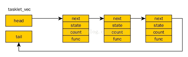 a -- 用指针t来表示当前队列元素,即当前需要执行的tasklet。