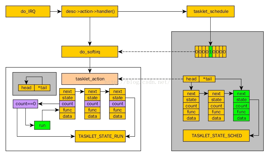 从上述过程以及tasklet的设计可以看出,tasklet整体是这么运行的:驱动应该在其硬中断处理函数的末尾调用tasklet_schedule()接口激活该tasklet;内核经常调用do_softirq()执行软中断,通过softirq执行tasket,如下图所示。图中灰色部分为禁止硬中断部分,为保护软中断pending位图和tasklet_vec链表数组,count的改变均为原子操作,count确保SMP架构下同时只有一个CPU在执行该tasklet: