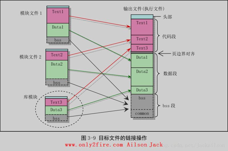 对于a.out格式的模块文件来说,由于段类型是预先知道的,因此链接程序对a.out格式的模块文件进行存储分配比较容易。例如,对于具有两个输入模块文件和需要链接一个库函数模块的情况,其存储分配情况如下图所示:
