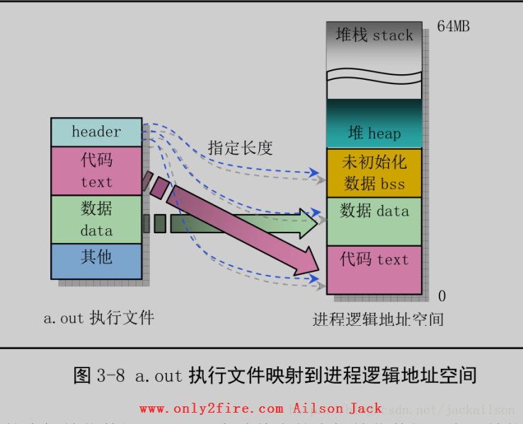 磁盘上a.out执行文件的各区在进程逻辑地址空间中的对应关系如下图所示: