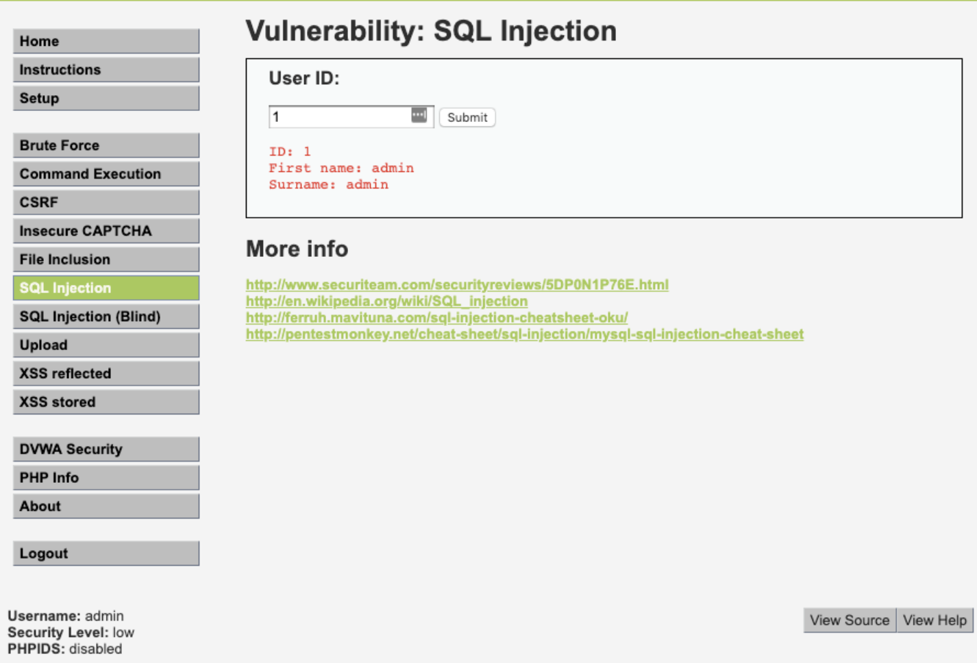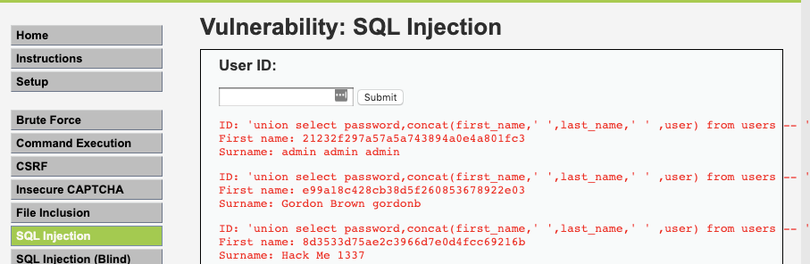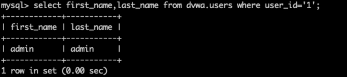 1 select first_name,last_name from dvwa.users where user_id=1;