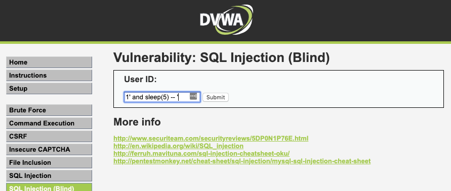 1 mysql>select first_name,last_name from dvwa.users where user_id ='1' and sleep(5) -- '