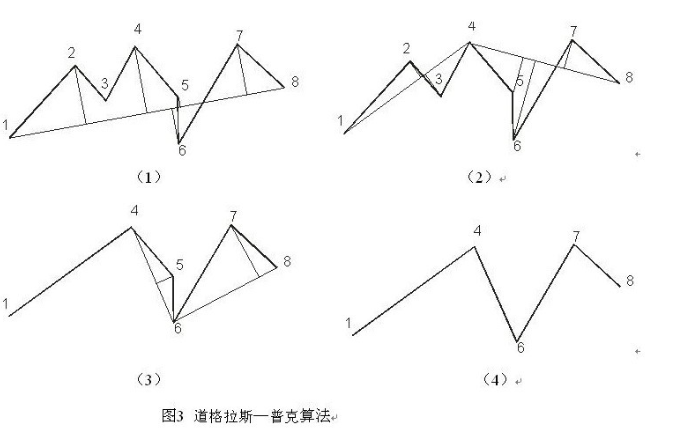 1)虚构连接一条直线到曲线的首末点,求出曲线上各点与直线的距离,求出最大距离值dmax。将 Dmax 与预先给定的阈值 D 进行比较: