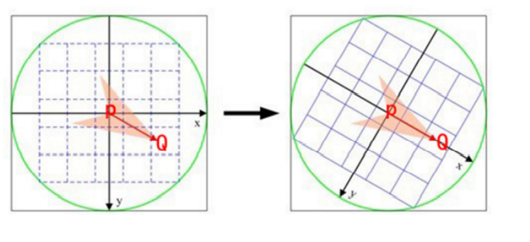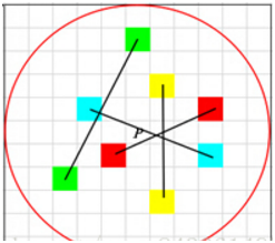 在一个圆域中算出m10(x坐标)和m01(y坐标),计算步骤是先算出中间红线的m10,然后在平行于 x轴算出m10和m01,一次计算相当于图像中的同个颜色的两个line