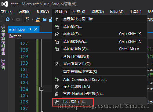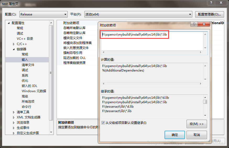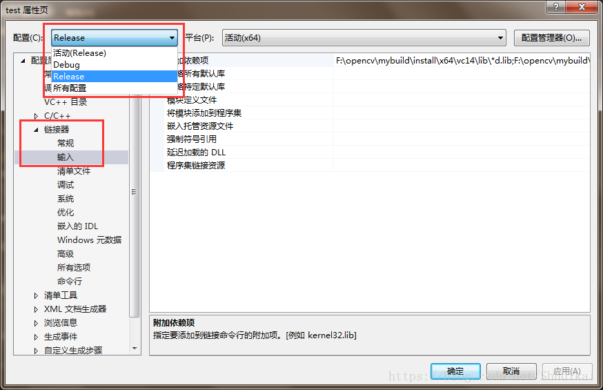 参考网上的说法大部分也不成功。最后找到了解决方案。在菜单栏中项目下找到test属性,打开后,在左上角配置中选择Release或者活动(Release),在下方的链接器->输入中进行OpenCV的相关配置。