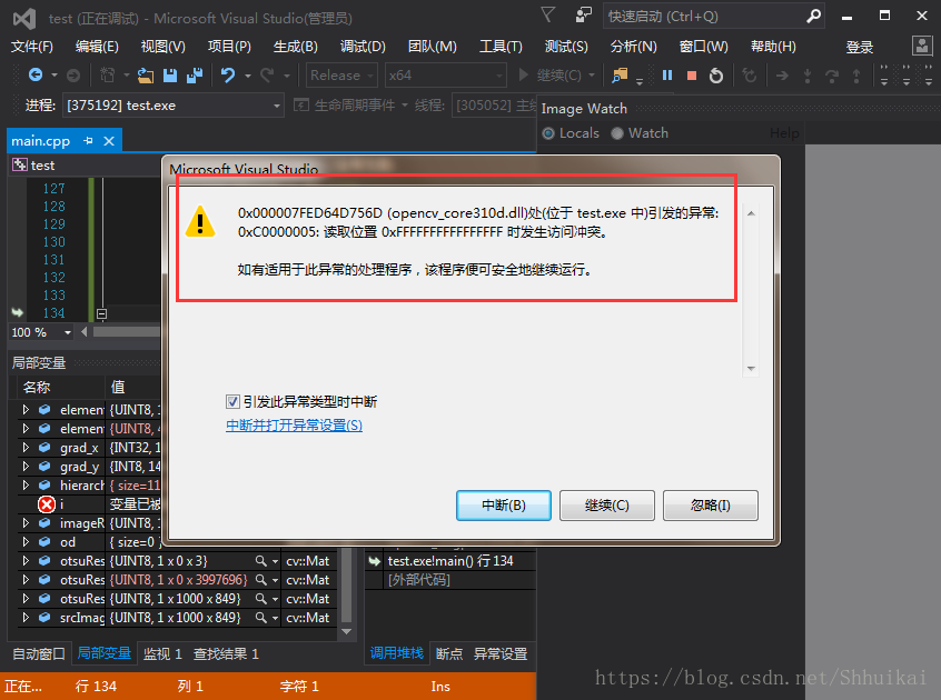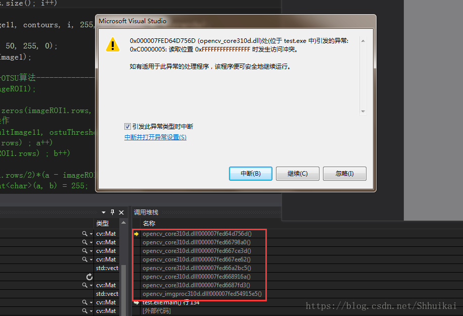 查看调用堆栈后发现中断原因和opencv_core310d.dll有关。这时第一反应是OpenCV配置不成功,在链接器->输入中将*d.lib删除后,仍然不成功。