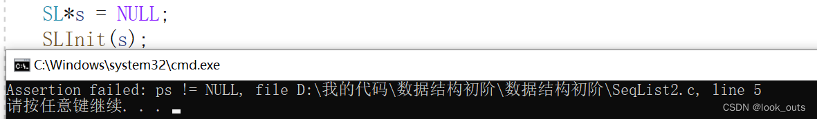 2. 传入实参的地址,带来了另外的问题,要知道在建立结构体指针后,其地址一定不为NULL,用户如果不小心或恶意传入空指针,就会造成空指针异常,导致程序崩溃。使用这个时候我们还要检查传入的动态顺序表结构体的地址是否为空。我们可以温柔一点用 if(ps == NULL) {……}来检查,但我更推荐使用assert语句进行暴力的断言处理,这样就可以在发生不符合assert语句里的条件的错误时,根据返回的信息快速定位错误的位置, 但要注意assert只在debug模式下生效。