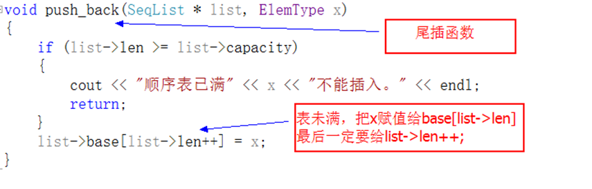 想要插入,顺序表必须没有满,判断条件:seqlist->len >= seqlist->capacity 表示顺序表已满,不能插入。