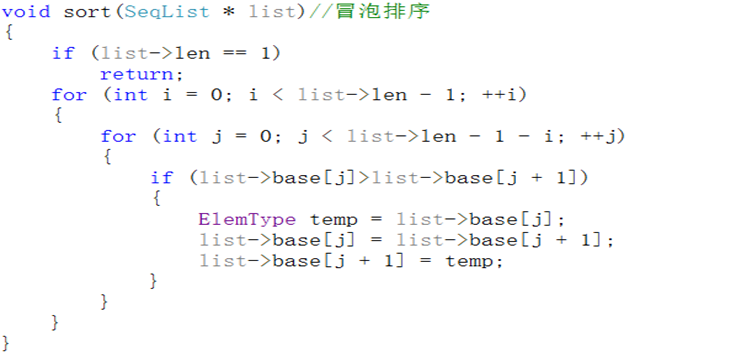 有n个元素,循环n-1趟(最后一趟就剩一个数。没不要和自己比,所以减1),每一趟中,循环j-1-i(最后一个元素没必要和自己比较,-i是因为跑完i趟就少比i个元 素),然后利用选择语句if(list->base[j] < list->base[j+1]) 前数小于后数,定义一个临时变量temp 交换两数( t = a ,a=b, b=t)。