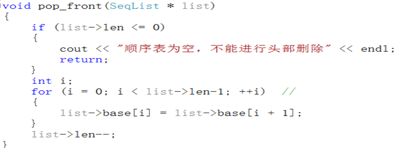 头删的话,顺序表不为空,从头部开始移动list->base[i] = list->base[i+1],最后len--;