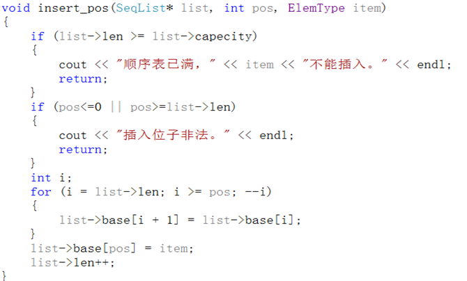 按位置插入的话函数原型必须有三个参数(顺序表,位置,插入元素),首先要插入一个元素必须顺序表不满(list->len >= list->capecity),其次插入的位置合法(pos>=0 || pos <list->len),最后插入元素,利用循环移动位置,别忘记给len++。