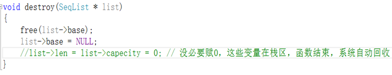 摧毁函数是在清理完成之后,必须手动释放自己开辟的空间(malloc动态开辟的空间在堆区),list->base 赋空,预防野指针。