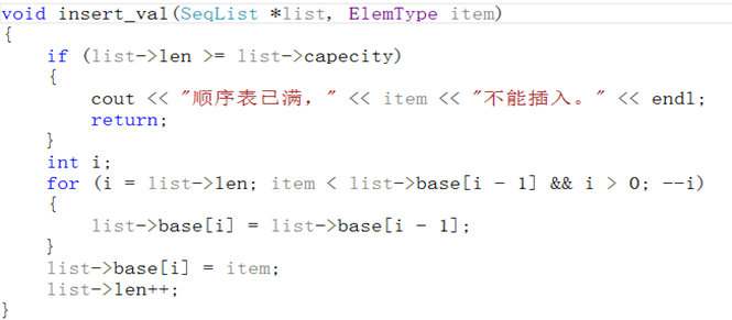 按值插入的话,首先要是一个排好顺序的顺序表(假如由小到大排序),插入首先顺序表不能满,其次循环比较,满足条件就移动数据(循环条件 i>0 && value<list- >base[i-1]),不满足条件跳出循环,把value插入,最后记得len++;