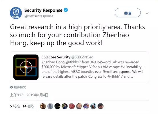 360冰刃实验室研究员洪祯皓发现了一个Hyper-V的漏洞,由于漏洞危险级别高,影响范围广,微软在确认漏洞细节后第一时间确认奖金并致谢漏洞发现者。