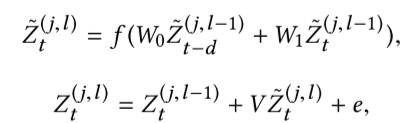 其中,由于因果卷积只作用域两个时间戳,所以滤波器的权重可通过两个权重矩阵表示,即上式中的 和 , 和 分别表示残差块之间的权重矩阵和偏置项。
