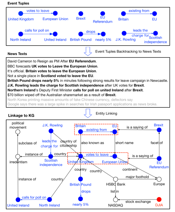 事件嵌入的目标是学习事件元组的低维密集向量表示,我们首先从财经新闻中提取结构化事件元组 ,其中, 表示行动者, 表示行动者的动作, 则表示动作执行到的目标。然后将得到的元组链接到知识图(KG)中。事件元组嵌入是通过对每个条目的KG嵌入和单词向量进行多通道连接来计算的。进一步地,文章中是通过开源库Open IE将非结构化的新闻文本转换为结构化的事件元组,过程是读取一个句子并使用关联短语和由关联短语关联的参数来提取事件元组。例如,“Britain exiting from the EU”这句话就被转换为了元组(s=Britain, p=exiting from, o=EU)。之后,在对得到的事件元组进行一些去重以去除冗余的信息。