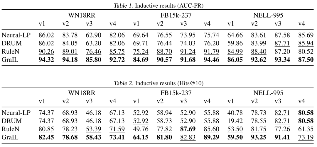 作者在本文中将该方法和一些其他可以利用与归纳式关系预测场景的方法在标准数据集上进行对比,得到如下结果。