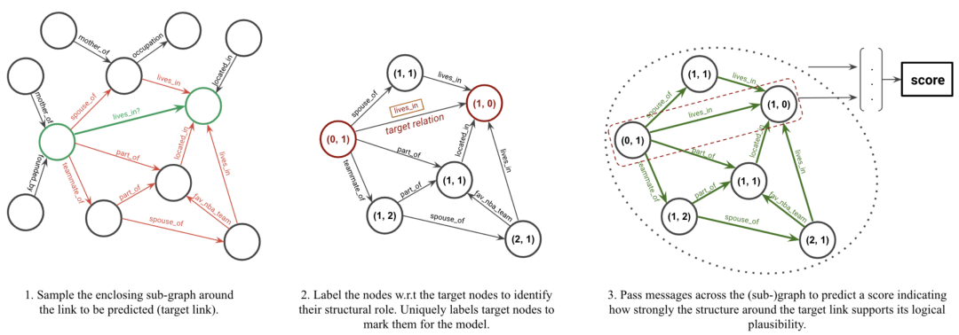 模型设计的是让该模型可以捕获到KG中潜在的规则,而不用对每一个实体学习一个专门的表示。这里的假设是对于两个需要被预测关系的目标节点(目标实体),它们之间的路径包含了被预测关系的信息。整个模型分为三个步骤