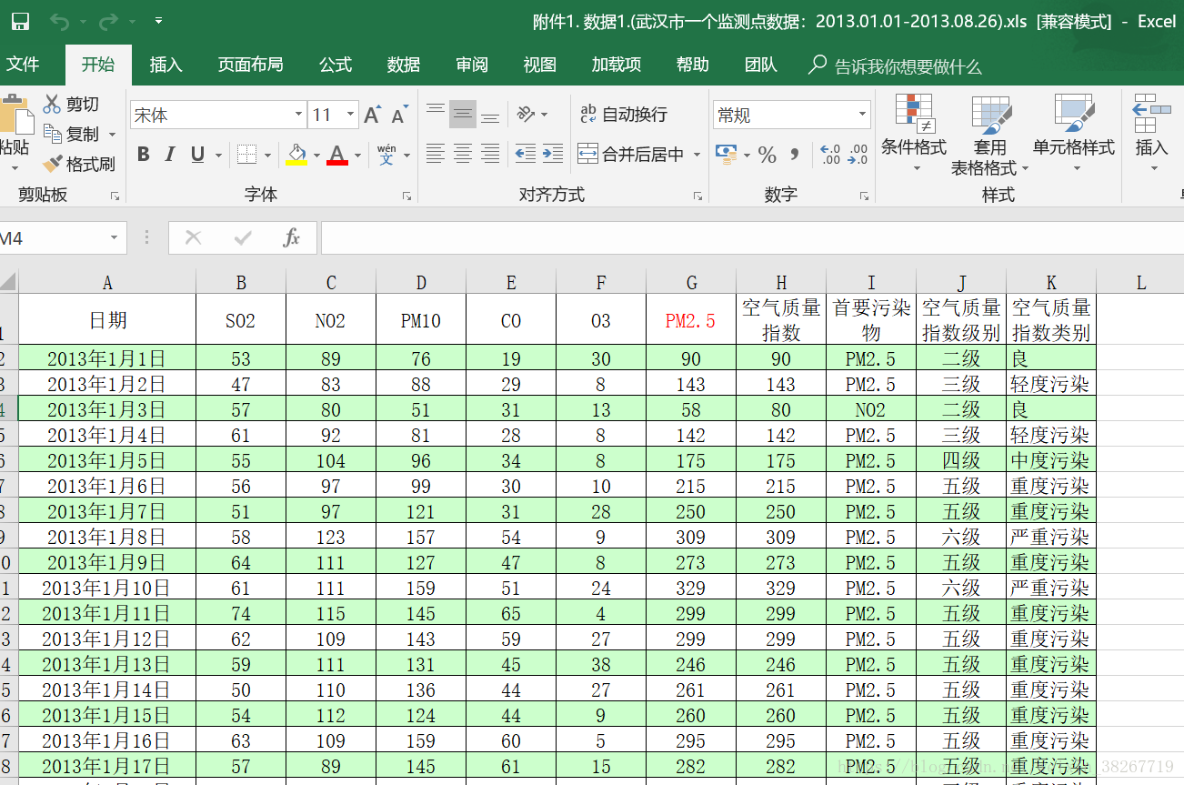 data_train = pd.read_excel("附件1. 数据1.(武汉市一个监测点数据:2013.01.01-2013.08.26).xls")
