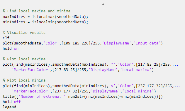 最后,键入关键字extrema,然后点击Find Local Extrema。使用smoothedData作为输入数据,并更改极值类型,以找到经过清理和平滑处理的数据的局部最大值和局部最小值。可以调整局部极值参数以找到更多或更少的最大值和最小值。