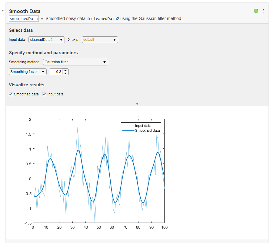 接下来,使用平滑处理数据任务来对在上一任务中经过清理的数据进行平滑处理。键入关键字smooth,并在任务出现时点击它。选择前一任务的输出cleanedData2作为输入数据。选择一种平滑方法,并调整平滑因子以实现更多或更少的平滑处理。