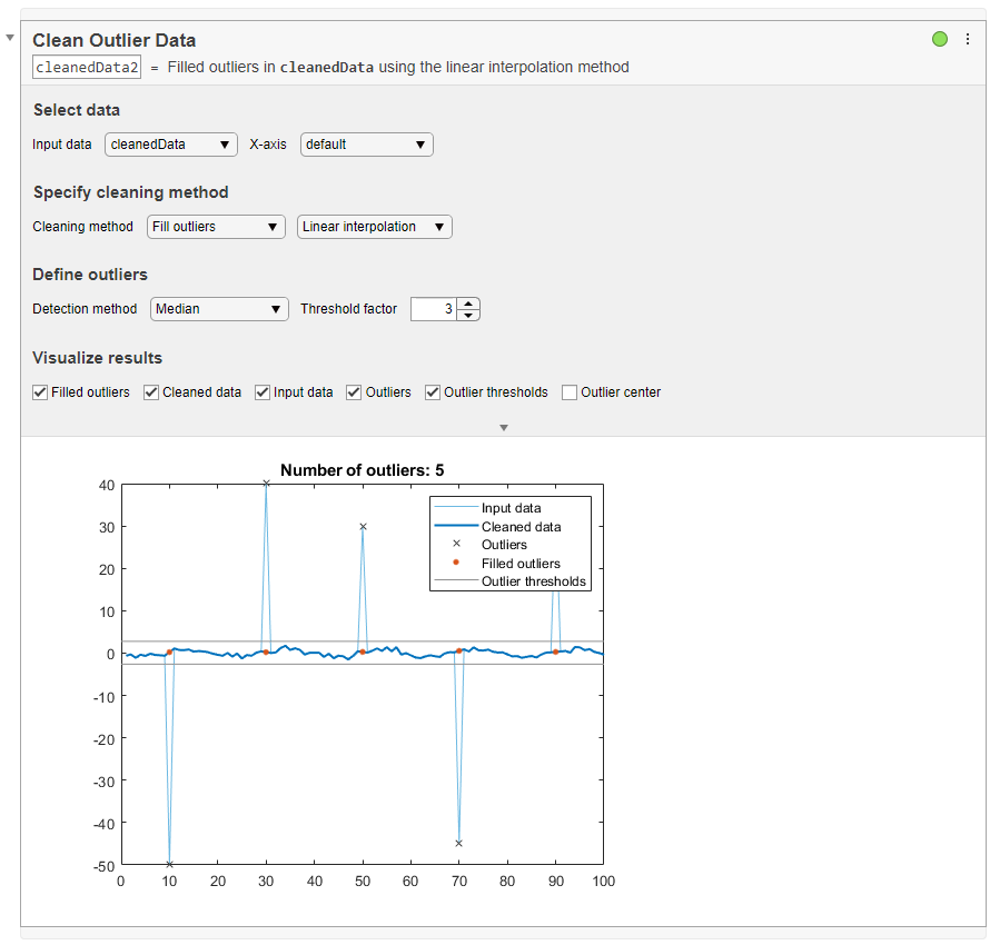 现在,可以使用清理离群数据任务从上一任务的经过清理的数据中删除离群值。在新代码块中键入关键字outliers,然后点击Clean Outlier Data打开任务。选择cleanedData作为输入数据。可以自定义清理和检测离群值的方法,并调整阈值以找到更多或更少的离群值。